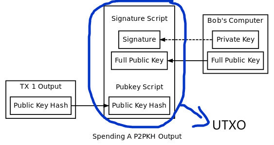 中间标蓝的那个"可形象化"意义的UTXO。其中TX 1 Output 的 Public Key Hash就是Bob的Full Public Key的Hash,别忘了比特币的地址是公钥的BASE58编码(双向)。可以把比特币的交易链想象成一个水管的管道网络,把UTXO表示网络中的一个交汇接口,这个接口上有一个阀门(Pubkey Script),默认是关闭的,水不能从这个接口流向其他管道,而打开这个阀门需要一把钥匙(Bob的private Key),这样才能打开阀门,让水流向另外的接口(UTXO)。