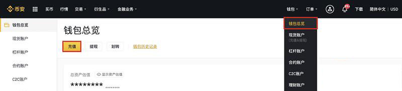 1. 登录币安官网(如果你还没有账号可以点此注册新账号),在您成功登陆账户后,点击右上方【钱包】→【钱包总览】,选择【充值】。(注意:国内用户目前仅支持邮箱注册!)