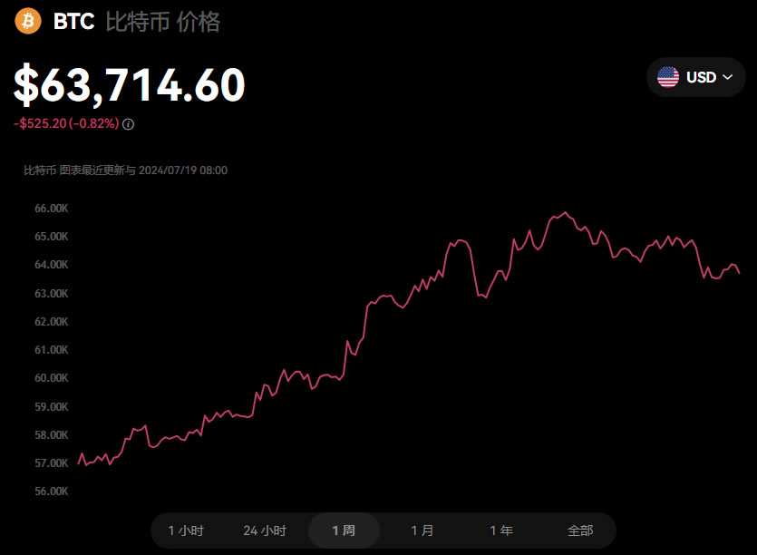 比特币是目前最昂贵的加密货币,截止7月19日,比特币 当前价格为 $63,714.60。比特币 的价格在过去 24 小时内下跌了 -0.82%。目前,比特币 市值排名为第 1 名,实时市值为 $12,559.40亿,流通供应量为 19,727,481 BTC,最大供应量为 21,000,000 BTC。我们会实时更新 比特币/USD 的价格。