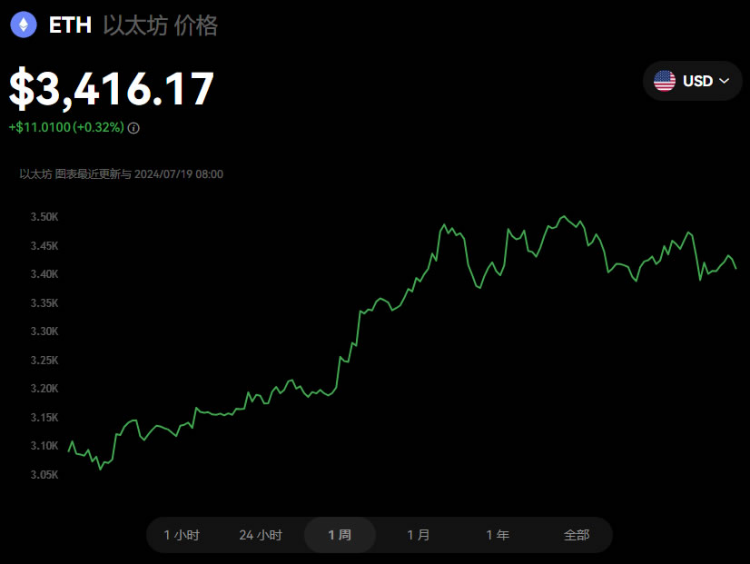 截止7月19日,以太坊 当前价格为 $3,416.17。以太坊 的价格在过去 24 小时内上涨了 +0.32%。目前,以太坊 市值排名为第 2 名,实时市值为 $4,110.88亿,流通供应量为 120,222,728 ETH,最大供应量为 120,222,728 ETH。我们会实时更新 以太坊/USD 的价格。