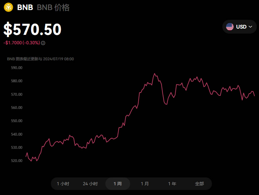 截止7月19日,BNB 当前价格为 $570.50。BNB 的价格在过去 24 小时内下跌了 -0.30%。目前,BNB 市值排名为第 3 名,实时市值为 $878.21亿,流通供应量为 153,856,150 BNB,最大供应量为 200,000,000 BNB。我们会实时更新 BNB/USD 的价格。因此,您可以买卖币安币以获得可能的最大收益。