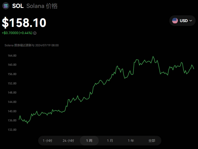 截止7月19日,Solana 当前价格为 $158.82。Solana 的价格在过去 24 小时内上涨了 +0.97%。目前,Solana 市值排名为第 4 名,实时市值为 $736.66亿,流通供应量为 464,272,115 SOL,最大供应量为 580,441,454 SOL。我们会实时更新 Solana/USD 的价格。