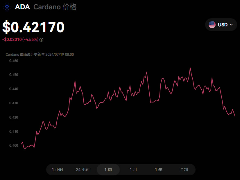 截止7月19日,艾达币ADA当前价格为 $0.42170。ADA币的价格在过去 24 小时内下跌了 -4.55%。目前,ADA币市值排名为第 10 名,实时市值为 $150.34亿,流通供应量为 35,567,296,769 ADA,最大供应量为 45,000,000,000 ADA。我们会实时更新 Cardano/USD 的价格。