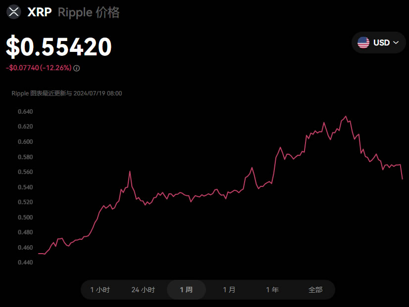 截止7月19日,XRP币当前价格为 $0.55420。XRP币的价格在过去 24 小时内下跌了 -12.25%。目前,XRP币市值排名为第 7 名,实时市值为 $310.07亿,流通供应量为 55,909,481,874 XRP,最大供应量为 100,000,000,000 XRP。我们会实时更新 Ripple/USD 的价格。