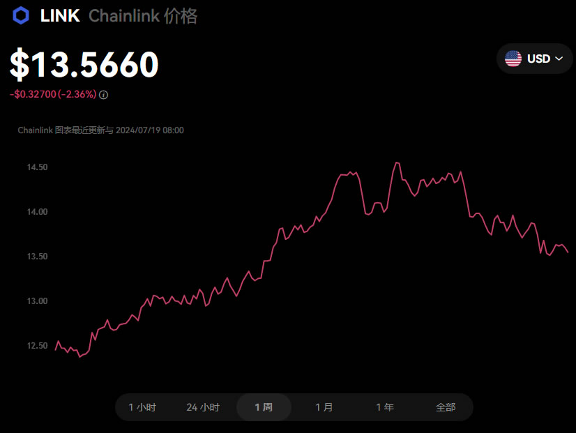 截止7月19日,LINK币当前价格为 $13.5660。LINK币的价格在过去 24 小时内下跌了 -2.35%。目前,LINK币市值排名为第 17 名,实时市值为 $82.53亿,流通供应量为 608,099,971 LINK,最大供应量为 1,000,000,000 LINK。我们会实时更新 Chainlink/USD 的价格。