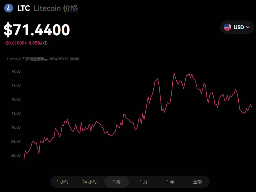 截止7月19日,莱特币LTC当前价格为 $71.6200。LTC的价格在过去 24 小时内下跌了 -0.58%。目前,LTC市值排名为第 22 名,实时市值为 $53.56亿,流通供应量为 74,764,958 LTC,最大供应量为 84,000,000 LTC。我们会实时更新 Litecoin/USD 的价格。
