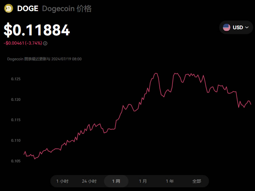 截止7月19日,狗狗币当前价格为 $0.11908。狗狗币的价格在过去 24 小时内下跌了 -3.56%。目前,狗狗币市值排名为第 9 名,实时市值为 $172.91亿,流通供应量为 145,147,656,384 DOGE,最大供应量为 145,171,606,384 DOGE。我们会实时更新 Dogecoin/USD 的价格。