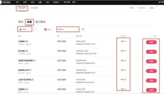 10、选择【C2C买币】——【出售】就可以看到众多出售USDT商家,根据情况选择合适的商家,点击【出售USDT】,填入卖出数量,点击【出售USDT】即可变成人民币。